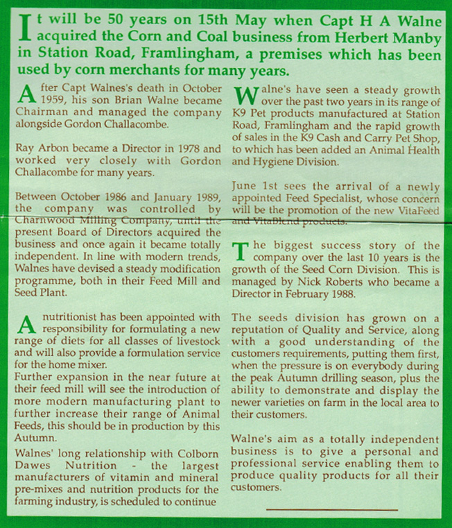 Founded in 1939 by Captain Henry Alfred Walne, this forward-thinking agricultural business evolved from a traditional corn merchant into a diverse farm supplies company, which prospered when Framlingham welcomed the railway, linking the thriving market town to Ipswich and its busy port. Trade flourished as HA Walne grasped opportunities to broaden its customer base beyond the local farming sector.